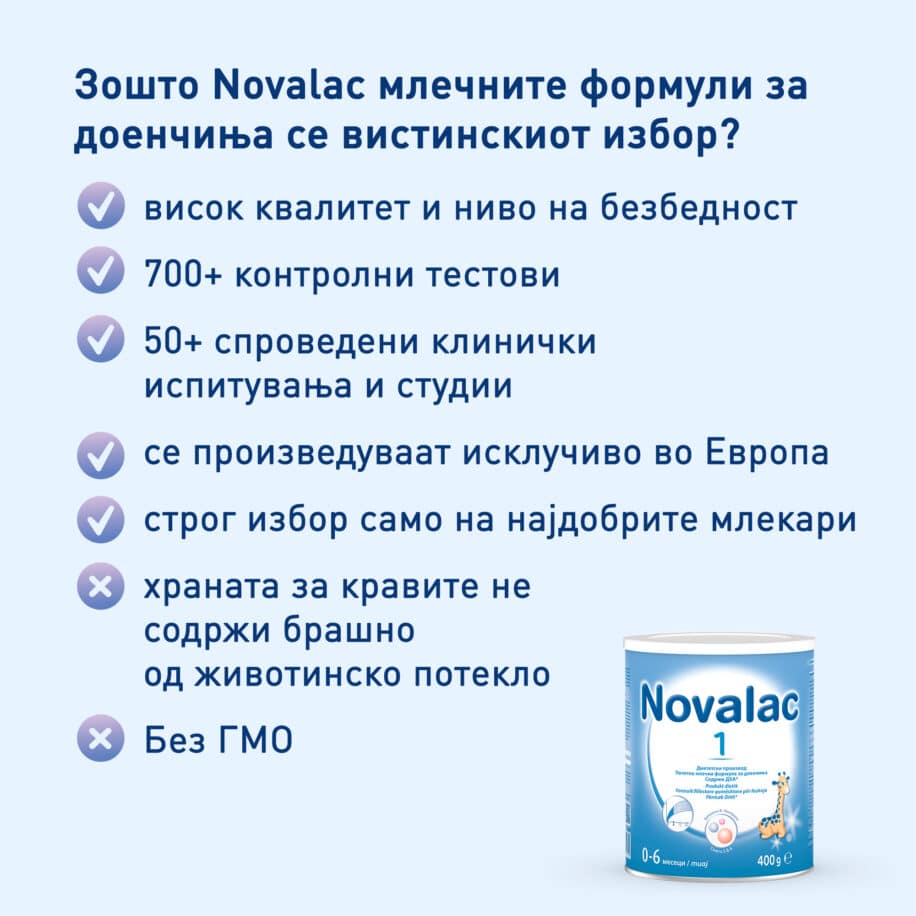 Novalac 1 почетната млечна формула е најдобар избор за доенчиња од раѓање до 6 месеци доколку мајките не ги дојат или делумно ги дојат.