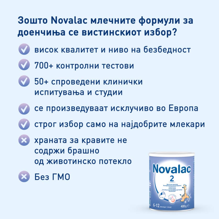 Составот на млечните формули Novalac е во склад со европските стандарди за детската млечна храна и не содржи генетски модифицирани организми (ГМО), а не содржи ни глутен.