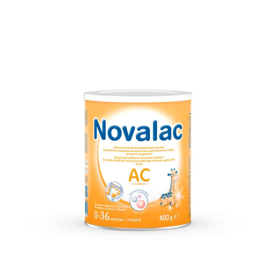 Novalac AC е единствена почетна формула прилагодена за доенчиња со грчеви. Има намалена содржина на лактоза, која одговара на дигестивниот капацитет на тенкото црево и затоа спречува формирање гасови и надуеност.