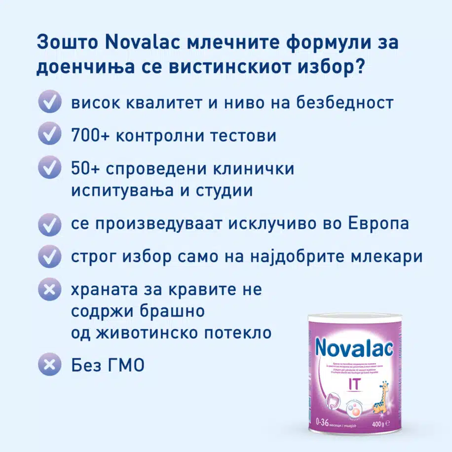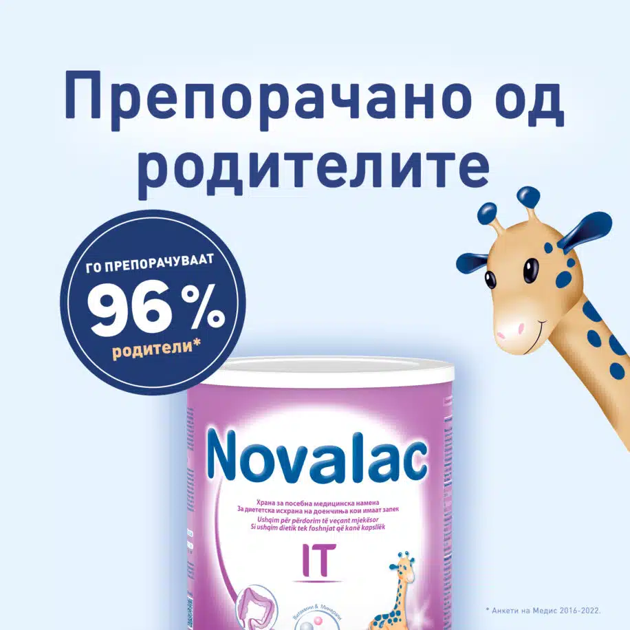Novalac IT е храна за посебна медицинска намена за диететска исхрана кај доенчиња и мали деца кои имаат запек.