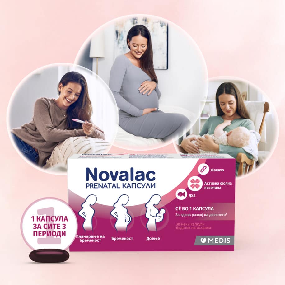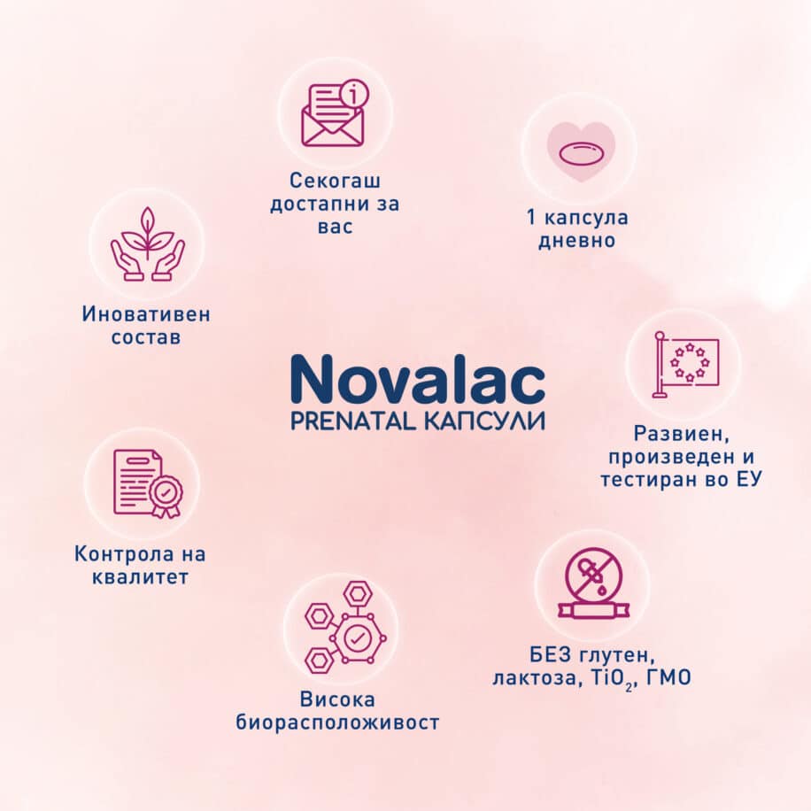 Novalac Prenatal капсули се производ од најновата генерација за жени кои планираат бременост, бремени или дојат. Со само 1 капсула дневно се задоволуваат зголемените дневни потреби за сите најважни хранливи состојки кои придонесуваат за здрав развој на доенчето.