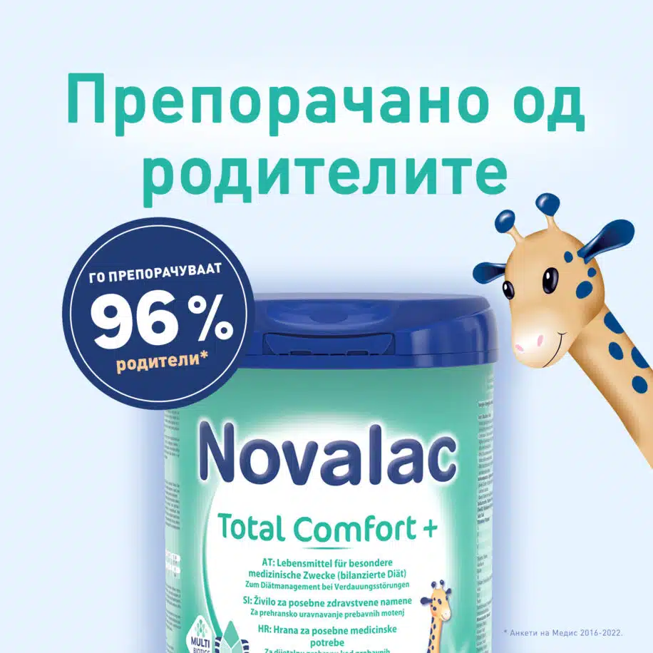 Novalac Total Comfort + е храна за посебна медицинска намена, за диететска исхрана на доенчиња со гастроинтестинални нарушувања како што се регургитација, болки во стомакот и гасови поради нетолеранција на лактоза и запек.